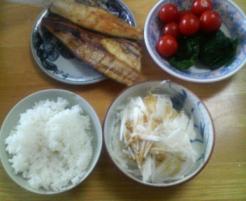 実家で食べた昼食は、ご飯、ホッケの焼き魚、長芋、ほうれん草です。