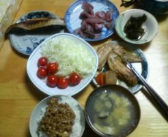 昨日の夕食は納豆ご飯、蜆味噌汁、手羽先煮付け、キャベツ千切り、ミニトマト、ホッケの焼き魚、フクラギ(イナダ)の刺身、昆布巻きです。