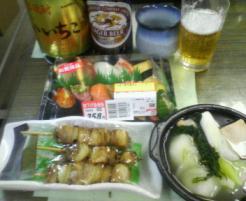 昨日は遅くまで仕事して疲れたので飲みました。ビール1本といいちこお湯割り2杯と焼き鳥、寿司、鮭の鍋です。
