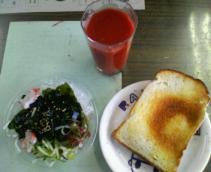 15日の朝食です。トースト、海鮮サラダ、野菜ジュースです。