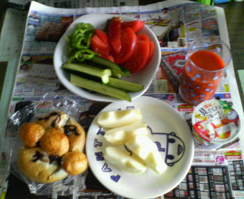 一昨日の朝食はアンパンマンパン、キュウリ、トマト、ピーマン、ヨーグルト、リンゴ、野菜ジュースです。
