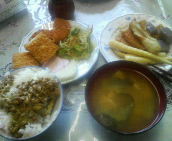 昨日の昼食は納豆ご飯、味噌汁、筍煮物、コロッケ、野菜サラダです。夕食は食べませんでした。