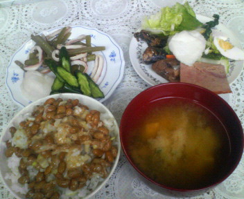 一昨日の昼食は納豆ご飯、味噌汁、キュウリ漬物、ミズ炒め、サンマ、チャーシュー、茹で卵、野菜サラダです。夕食は缶ビール2本とツマミでしたよ。
