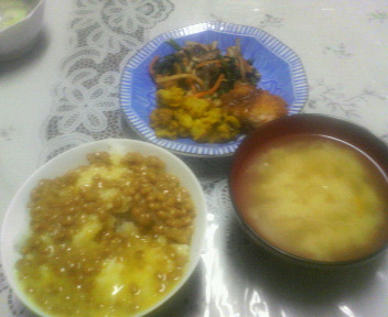 昨日の夕食は納豆卵かけご飯、味噌汁、具沢山メンマとホーレンソウとコロッケです。