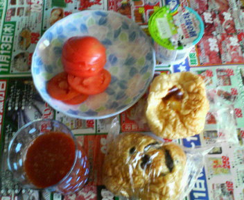 昨日の朝食は実家のパンとトマト、野菜ジュース、ヨーグルトです。