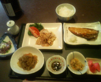 昨日の夕食は歓都里のおまかせ定食1000円です。ビール一杯と焼酎お湯割り2杯飲みました。ホッケ焼き魚、鯵叩き、すき焼き、ナマコ、 焼き肉、他です。これにご飯、味噌汁ついて1000円は安いですし、うまいです。