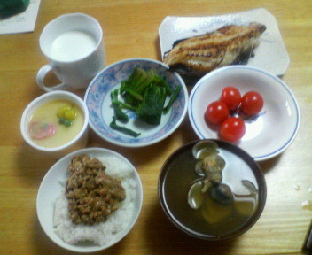 昨日の朝食は納豆ご飯、浅蜊味噌汁、鯵焼き魚、茶碗蒸し、ほうれん草、ミニトマト、牛乳です。