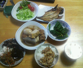 昨日の朝食は実家です。納豆ご飯、オデン、鯵焼き魚、ほうれん草、ミニトマト、レタス、ピーマン、きんぴらごぼう、ヒジキ、昆布煮付け、ポテトサラダです。