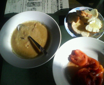 昨日の昼食はホワイトカレーと実家のふらんすパンです。トマトは長い間、冷蔵庫に入れ過ぎて腐って食べられませんでした(笑)。