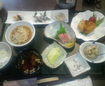 昨日の夕食は歓都里のおまかせ定食1000円です。昨日は白魚卵とじ、カンパチ刺身、コロッケ、ゴボウサラダ、他です。