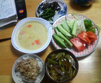 昨日の朝食は実家です。納豆ご飯、タツ醤油汁、シチュー、ピーマン、キュウリ、トマト、昆布、菜の花辛し和えです。