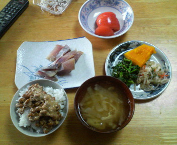 昨日の朝食は実家です。納豆ご飯(くっちゃん納豆)、味噌汁、フクラギ、カボチャ、菜の花辛し和え、大根白あえ、トマトです。