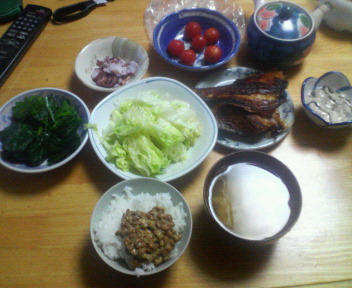 昨日の夕食は納豆ご飯、味噌汁、ほうれん草、レタス、カキ、赤魚、蛸、ミニトマトです。