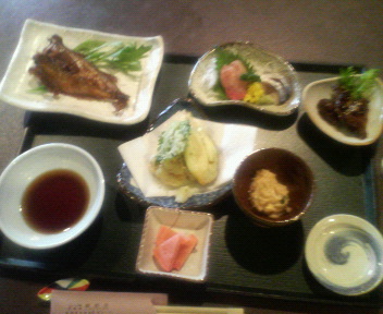 昨日の夕食は歓都里のおまかせ定食1000円のオカズです。ハタハタ唐揚げ、刺身、天ぷら、モツ唐揚げ他です。