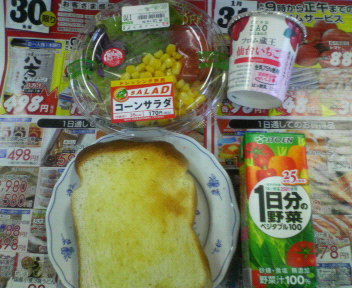 昨日の朝食はトースト、野菜サラダ、野菜ジュース、ヨーグルトです。