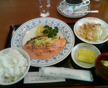 昨日の昼食は労福会館4階のシャモワのランチです。鮭のムニエルランチ500円です。