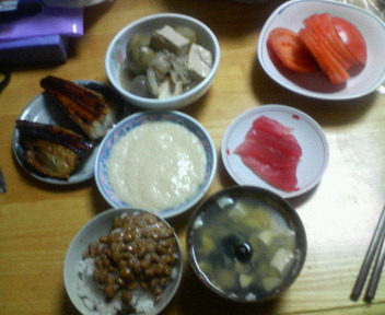 昨日の夕食は久しぶりに実家です。納豆ご飯、蜆味噌汁、長芋トロロ、ホッケ、オデン、トマトです。