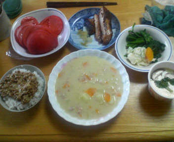 木曜日の朝食は実家です。納豆ご飯、シチュー、茶碗蒸し、トマト、ポテトサラダ、ほうれん草、サンマです。