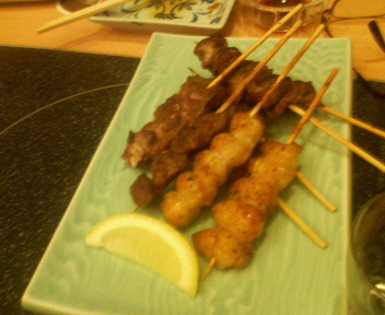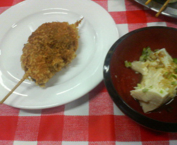 木曜日の夕食は労福会館の屋上ビアガーデンです。串カツと豆腐です。