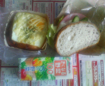 土曜日の朝食はイートファンの春恋サンドポテト、ハムエッグパン、野菜ジュースです。