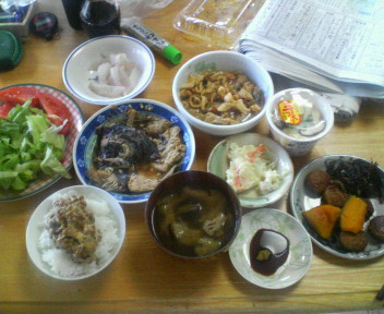 10月5日の朝食は実家です。納豆ご飯、味噌汁、鮃煮付け、鮃刺身、レタス、トマト、カボチャ、ヒジキ、鶏つくね、ホヤ、茶碗蒸しです。