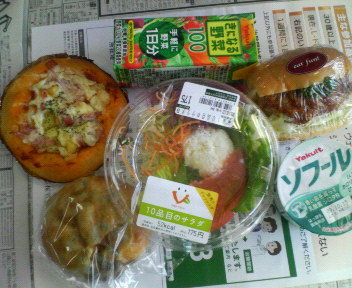 11日の朝食はイートファンのポテトピザパン、三色豆パン、牛肉コロッケパン、サラダ、野菜ジュース、ヨーグルトです。