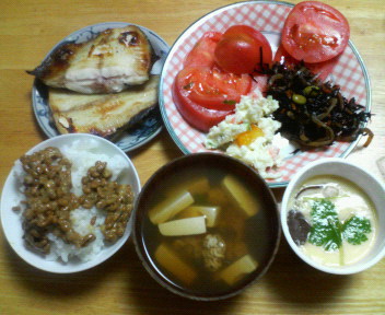 11日の夕食は実家です。納豆ご飯、たつ醤油汁、茶碗蒸し、鰈塩焼き、トマト、ポテトサラダ、ヒジキです。