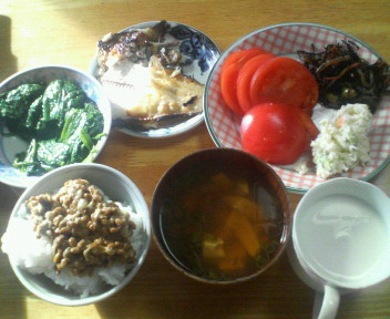 昨日の朝食は実家です。納豆ご飯、牛乳、ほうれん草、鰈塩焼き、トマト、トマト、ヒジキです。
