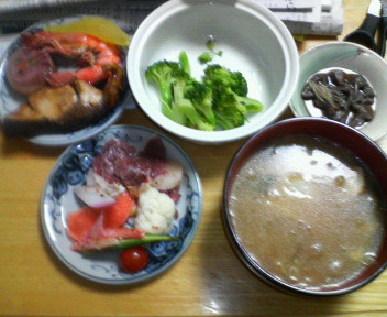 1月1日の夕食は雑煮とブロッコリー、大晦日のご馳走の残りの刺身、海老焼き、ブリの照り焼き、ナマコ、カルパッチョです。