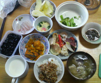 1月2日の朝食は納豆ご飯、味噌汁、カボチャ、黒豆、ナマコ、ブロッコリー、刺身、茶碗蒸し、カルパッチョ、リンゴ、牛乳です。
