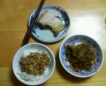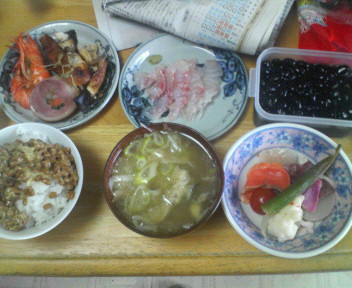 1月3日の朝食は納豆ご飯、ソイ味噌汁、黒豆、タイ刺身、カルパッチョ、海老焼き、ブリ照り焼きです。
