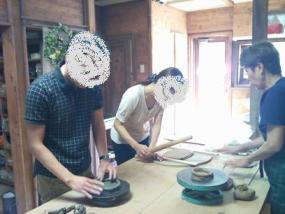 9月21日先日、相方さんの先輩で、私も港町時代に同じ職場でお世話になっていた素敵なご夫婦とご一緒させていただきました。奥さんの方が陶芸をされていて、誘っていただき夫婦で体験してきました。陶芸初体験。土をこねて、成形しています。私は四角いお皿。旦那はお鉢に挑戦。ちゃんとできるか心配でしたが、先生が本当に上手に導いてくれます。下手したら「私ってセンスあるかも…」と錯覚するくらい上手に導いてくれます(笑)。初心者でも安心です。普通、体験コースって決まったモノを作る教室が多いと思いますが、この教室は自分の好きなものを作らせてもらえます。旦那は美術大好きで器用なのですが、私は美術は苦手で不器用・・・。でも、できあがりましたよ。なかなか上手でしょ。なんちて(笑)。裏には、ちゃんと自分のネームが入っています。世界でひとつ。 焼きあがりがとても楽しみです。誘ってくださった奥さんの作品を見せてもらいましたが、どれも本当に素敵でかっこよかったです。いいですよね。自分の作った器でご飯を食べるって。なんだかあったかいです。夜は、ご主人も交えて4人でお食事をしました。久々にお会いしましたが、とても楽しいお酒でした。大満足の一日。ありがとうございました☆。☆追伸☆ 送っていただいた写真転用させてもらいました。