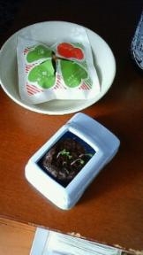10月15日風邪ひいたみたい。頭が痛いし熱っぽいし。全身だるくてしかたありませんでした。薄着の産物です。身体を冷やすとすぐに体調に出てきますね。思わず「若いころは全然へっちゃらだったのに・・・」とゆう言葉が。ババシャツなんてありえなかったもん。旦那さんが不在なので、実家に帰るつもりにしてたけど、風邪ひきなので足止め。今日はもう楽になったので帰ろうかなっと。みなさんも「冷え」にはお気を付けください。☆おまけ☆お友達にいただいた種まきセットが芽を出しました。日光を求めてちょっと横を向いていますが(笑)。ちなみに鉢はラパンなんですよ。新型だそうです。