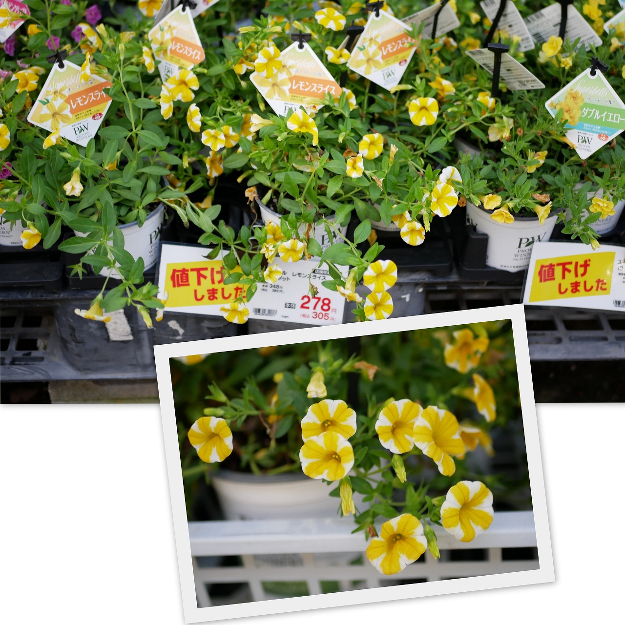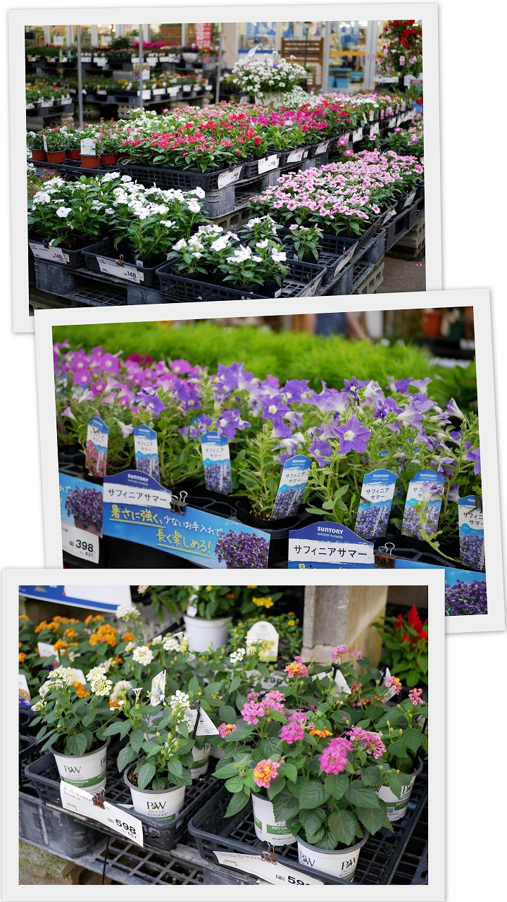 お花の他にも野菜の苗や土や砂利や園芸用品が外に置いてます