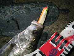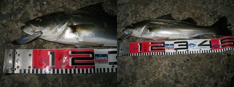 3月10日(土)昼間にメタルジグでスズキが爆ったという釣り場へで、さっそくジグをキャストええ感じの離岸流は流れているものの・・だが、そこは真昼間。まったく釣れる気がしないので10数投投げて試合終了。家に帰って、飯を食って糞をタレて紙で拭いて夜に出なおそうかのう。で、家でネット見ていると・・今では、南部地区TOPクラスの実力者T氏のBLOGぐぬう。予定変更じゃ。日没直後19時頃から、ポイント入り流れる場所をチェックも兼ねランガン全エリアの半分ぐらいをグースで残り半分ぐらいのエリアをブル公でチェックが、アタリも全くなく流れもイマイチな感じ。で、すでに20時過ぎ・・ど~もだめっぽいので、ルアーをキャストしながら車のところまで戻り試合終了計画。ルアーは、今まで一度も使ったことのないゼファ~のセラ?だったか、セラのゼファ~?とやらのウッド製ルアーをキャスト車止めてる場所まで、あと半分ちゅうところで・・を?離岸流が流れ始めおるばい。こりゃ粘る価値ありばい。で、ほどなく・・ゴゴン!完璧なアタリ20時19分・・1本目仔マルまたしてもゴゴン!20時36分・・2本目仔マルまたしてもゴゴン!20時52分・・3本目55センチこの時点では、気付かなかったが斑点がある謎の個体。ウワサのタイリクスズキなのか?マルは通常30センチぐらいになると斑点は消滅する。(※有明海産は例外的に斑点が成魚にもある。)またしてもゴゴン!21時ジャスト・・4本目またまた仔マル42センチその後、30分アタリすらなく地合終了と判断試合終了。本日の釣果本日のたっくルロッド:ダイコープレミアBROS962MLリール:DAIWAフリームスKIX2500ライン:東レ シーバスPE2号ルアー:ゼフア~のセラ?パールホワイトこのルアーはマジでヤバイです。今回初めて実戦投入したとですばってんルアーが魚を連れて来るという感じですばい。ただ、ウッド製でバカ高いのが難点。それと、腹側のフックにHITしたときに後部フックがシーバスの目に掛かってしまうケースが4匹のうち2匹発生。キープ派の僕ちゃんにはど~でもええんですが、リリース派の方は、使用が避けたほうがよいかもですばい。