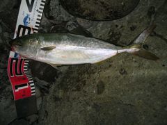 10月20日(土)今日は、完全に休みなんだが、潮位表を見る限り、結構シビアな感じだ。おまけに、風が強いんでどこ行こうかいな。まあ、ど~でもえ~がゴロタに行くかい。まあ、今日はボーズ覚悟モード。潮も動かんごたっし、なんとなくダメポぽい。で、朝5時45分頃から、毎度の愚の骨頂のジグ投げ開始。が、10投以上するも何もあたらず。完全に明るくなった。で、ジグをキャストしフォール中・・ジグが引っ手繰られた。サワラか?が、まずまずのファイト。が、かまわずゴリ巻。で上がったのは・・・暴れてメジャーがうまく当てられんばい。42~43センチぐらい。で、〆たり、茶飲んだりして再びキャスト。で、ジグの回収中のタダ巻に・・・ゴゴン!HIT!7~8メーターの位置だったんで、秒殺。さっきと同じサイズ。が、この後アタリすらなし。干潮潮止まりから、上潮1時間様子見がてら、ジグキャストするも全く反応なし。午前9時前試合終了とした。(※はっきり言って粘りすぎ時間のムダムダでした。)結果からだけ見れば、先週と同じメジロ(長崎でヤズ)2本。状況は全然悪かったですね。フォール中や回収中のジグにHITしても釣った気しませんですわ。全く。早巻中のドカン!が最高ですね。個人的にですが。