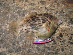 10月14日(土)朝まずめ、40UPのメジロ2本釣って、青物1匹病脱出。で、夕まずめ。懲りずにメッキ狙い。夕方5時半、釣り場到着。今日は、この潮位では釣れないであろうことの確認の為、釣行なのだ。データ蓄積のためね。で、10投ほど、キャストするも予想通りなんもHITせず。が、あまりにもつまらんので、スプーン10グラムぐらいを漁港の岸壁沿いに落とすと・・メッキが3匹。が、釣れず。この1フォールでスレた。その後、反応なし。で、スプーンを躍らせていると・・カワハギがじゃれつきHIT。か、かわいい。ぽっあまりにも、かわいいのでリリース。ちなみに僕ちゃん魚をリリースするなんて言葉は偽善っぽく個人的には大嫌いなんで『海洋投棄』という表現を使うんだが、今回は人生初リリース。外道の『海洋投棄』はしょっちゅうしてますよ。で、スプーンを躍らせていると・・またまた、リリースしたカワハギがじゃれついてくる。ぐぬう。君ね。じいさんや子供に釣られていたら、間違いなく殺されていたんだよ。命は大切にせんかい!と叱りとばし移動。で、またまたアレの近くからスプーンを躍らせていると・・何と、岸壁に張り付いていたのかヒラメがスプーンにアタック!が乗らず。というか食い損ねた。で、すぐ足元のアレの上に仔ヒラメが・・手を伸ばせば掴めそうな距離だったんで、掴もうとするも、逃げられた。ホコさえあれば・・で、アレの上を見ると立ち居地から2メーターぐらいの場所にもう1匹。小ジグを目の前で躍らせても反応しないので、頭の上にジグ直撃させたら逃げた・・スレ掛り狙ったんだけどね。テヘッ!あまりにも、くだらん釣りに自身にブチ切れ、ヤケクソで小ジグのフルキャスト。で、ボトムまで沈め早巻開始。で、何かHIT?結構引くばい。足元でギラっ!こりゃヨカ、メッキやね。自己最高サイズかもばい。で、アレの上にブリ上げ。よ~引く思うたらGTやん。体高あるんで、でかく見えたが計ったら22センチしかないのね。ギンガメメッキの26~27センチサイズの体高ありますよ。こやつ。で、午後6時試合終了とした。ヒラメって、岸壁にも張り付くのね。ワームあったら釣れたね。間違いなく。