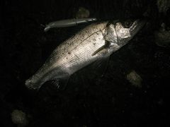 10月27日(土)朝まずめ、青物が釣れなかったため、夜に3ヶ月半ぶり?のシーバス狙い。もう、間違いなく釣れる時期のはずばい。朝まずめのTOPゲームに釣れているというのが、ちと気になるんだが。で、午後8時到着。駐車場前に釣り師がひとり。で、話かけると700グラムほどのミズイカが釣れているらしい。で、なんとこのおじさん。駐車場の地主さん。いい人でしたYo!んで、午後8時半ごろから、まずはイカ狙いのエギング。朝、『できるアングラー』から盗んだテクをさっそく試すと・・ゴゴン!ジジジジ・・・・・・何とエギにスズキがHIT!(※まあ、僕ちゃんがエギ投げるといつものことなんですが。)5秒ほど全力で走られスッポ抜け。こりゃ、スズキが居るンならイカは厳しかばい。頭にきて、エギにアシストフックをセット。で、投げてはしゃくること続けていると・・ぐぬう。ゴミかのう。アシスト着けたらイカかい!で流れがとまり、しばし休息。で、流れ始めにまずは磯からワームでスズキ狙い。1回しか反応はないはずなんで、超慎重にキャスト。何投か目にHIT!が、乗らず。潔く諦め、50メータほど移動。流れが速くなってきた。まずは、ヒラが着く場所にルアー(ブル公)投げるもノーHIT。しかたないんで、流れ攻略のマル狙い。自分の斜め前方45度にルアー投げ込み回収時には後方45度からルアーが戻ってくる。で、後方30度ぐらいの位置で・・ゴゴン!バシャバシャ!が、エラ荒いでバレ。ぐぬう。ヒラやったか。どうやら、おバカさんの仔ヒラ軍団がいるようだ。こりゃ、派手な打ち合いになりそうやね。マルやったら、このバラシでジ・エンドばってんね。で同じようなバラシをした後・・秒殺でようやくGET。で、その後・・すさまじい蛍光灯の明かりを持ったバカ電気ウキ師二人組みが登場し釣り場が昼間のような状態に・・こりゃもう釣れんな・・と思ったが、さすがはヒラのおバカさん軍団その後も2回HIT&バレ。で、最後にヤフオクでようやく調達した『凪』ヒラ最強ルアー・グース125Fチャートをキャストで、HIT。今度の奴はデカい。5秒ほど、引っ張り合いも全く寄らず、勝負に出ようとした瞬間バレ。これにて、さすがにアタリも止まり試合終了。まあ、秋のシーバス開幕戦は何とか1本でましたYo!エギ・ワーム・ハードルアー・・ルアーは何にでもあたってくるいいシーズン到来ですわ。