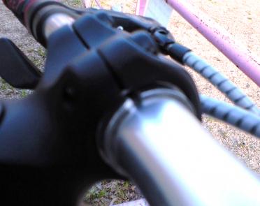 25.4Φのハンドルを31.8Φのステムに取り付けました。使用したのは、長さを調節するために切り落としたフォックスのフォークのステアコラムです。二つに切ってハンドルバーを挟み込んで、ステムに取り付けました。しっかり食い込んでびくともしません。実施の場合は自己責任で行って下さい。nico~インナーショップ~