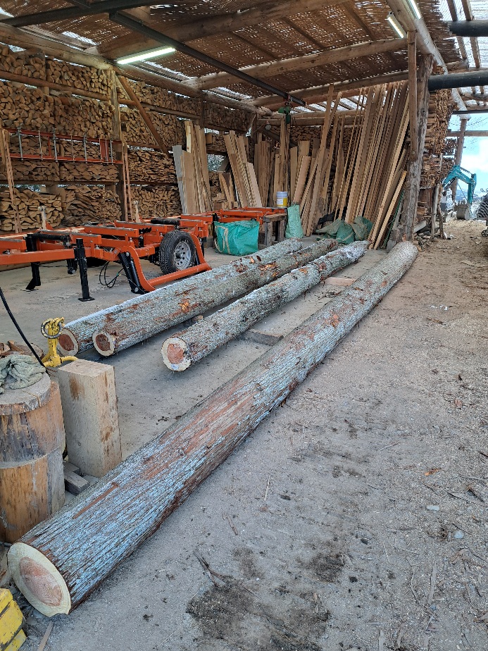 長尺4連発手前が8m奥が6m夏なら入れるのに四苦八苦ですが8mでも寒伐材なので軽いこんなに軽いとはビックリ👀大工さんがどんな風に使うのか楽しみですWood Mizerの製材機はレールを延長さえすれば10mでも20mでも製材出来のが魅力です