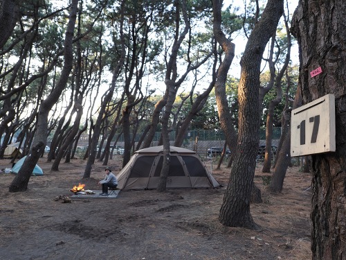 近場でお手軽にキャンプが楽しめる。海沿いにあるが、サイトは松林の中にあるので波の音も聞こえないし、眺望は何もない。サイトから少し歩くと海岸に出て、富士山も臨める場所だ。クルマはサイトの外に停めないといけないので、無料のリヤカーを借りて荷物を運ぶことになるが、サイトからそれほど離れていないので設営、撤収も問題ない。富士山見えます!山頂は雲の中・・・