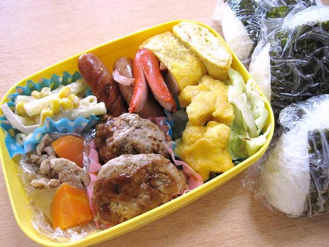 休日の公園弁当簡単に~ ・ハンバーグ・肉じゃが(じゃが見えないけど。。。)・ウインナー・卵焼き・チキンナゲット(市販)・マカロニサラダ・おにぎり(梅・鮭) そして今日のお弁当~ ・ウインナーの肉巻き・卵焼き・もやしのナムル・カニカマ・枝豆ごはんと、こんな感じですあっ、時間がないのでまた~
