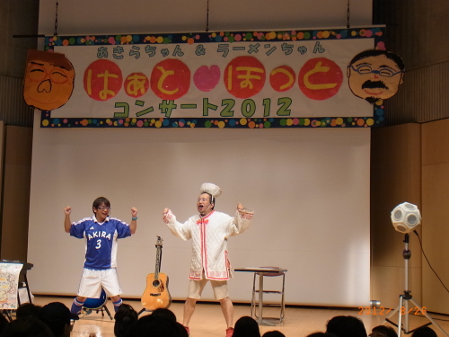 2012年11月11日酒田から車で15分ほど遠征し(遠征っていわないか・・・)、今日は庄内町のあきらちゃん&ラーメンちゃんコンサートに行ってきました。今日のセットリストは・・・1・はなれないふたり2・げんきにハーイそして3・へんしん!にんじゃじゃん・・・では庄内忍者隊が登場~大人も子供も一緒にステージで楽しめるってステキだなぁ~4・ラーメンちゃんのぶらぶらシアターでピンポ~ン5・ペンギンのプール体操 ゆいぽんとみくたんは、ペンギン帽子を持って行ってたんだけど、周りの子がかぶってないからかぶりませんでした 6・ハッピーハッピーバースデイ・・・では、みくたんは1人でステージに上がったものの、ニコニコしてるだけで全然踊らなかった。でも楽しかったみたい7・かあちゃん音頭(ピンクのTシャツのスタッフの方と)8・シアワセ気分(10人以上のパパたちが参加)9・最後はやっぱり・・・ラーメン体操でした 子育てしやすいと言われてる庄内町・・・手作り感が満載の楽しいコンサートでした