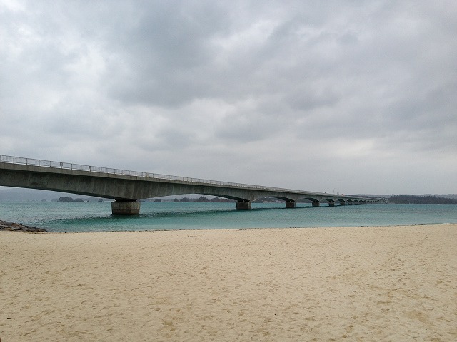 すっかり一週間に一回更新となってしまったので、全然進まない沖縄話のようやく2日目です。http://www.ric.hi-ho.ne.jp/joeshow/KA.Blog/20130301.html良い感じのホテルで良い感じの朝食を取った後は、ホテル周辺を散歩。天気はあいにくで浜辺も風が引き続き強かったですが、清々しい朝を迎えることができました(^^)その日はガイド付きタクシーで、沖縄北部を観光することになっていました。ホテルの玄関まで迎えに来てくれたタクシーに乗り込むと、この高級リゾートホテルとはお別れです。束の間の別世界でした(T△T)運転手の方は50代前半くらいの男性。名前は安藤さん(仮名)。物静かな感じの方で、やや車内の空気は重苦しい感じ。あまりテンション高く話かけられても面倒臭いですし、そういう意味でタクシーとは運転手との距離感がなかなか難しい乗り物です(-。-;)一応、要所要所ではガイドをしっかり入れてくれます。ただ必要最低限のことを二言三言しか言わない感じ。それに我々が「へー」とか「なるほど」とか相槌を打つと、その後はまたしばらく沈黙が続きます(・・;)沈黙に耐えきれなくなった私が「安藤さんはこちらの方ですか?(;^_^A」と尋ねると、ふっと笑って「新潟出身です。沖縄で安藤って言ったら、地元の人には一発で本土の人間だとわかりますよ」とのこと。あくまで私の偏見ですが、本土の人間が沖縄でタクシーの運転手をやっていると聞くと、何か訳ありのような感じがします。高倉健のような世界観に押され、また沈黙が続く車内(・・;)そんなこんなでタクシーに揺られ1時間半。まずは最初の目的地である古宇利大橋に到着しました。本島と古宇利島を結ぶ全長約2kmの長い橋で、無料の一般道では日本一の橋だとのこと。沖縄のオーシャンビューに映える巨大な人工構造物。晴れていたら青い海をモーゼの十戒感覚で気持ちよく進んで行けたのでしょうが、残念ながらその日は曇っていて、ガイドブックの写真などでみる爽快感はやや減(T△T)それでも丁度「純と愛」で時々出ていた宮古島の池間大橋のような、南国気分は十分に感じられました。橋を渡り切った所に公園があり、我々は一旦そこで休憩。その他にも観光客がたくさん訪れており、沖縄に来たら一度は行ってみたいスポットの一つです。この景色をひとしきり堪能すると、我々は一番の目的地である「美ら海水族館」へと向かうのでした。(つづく)