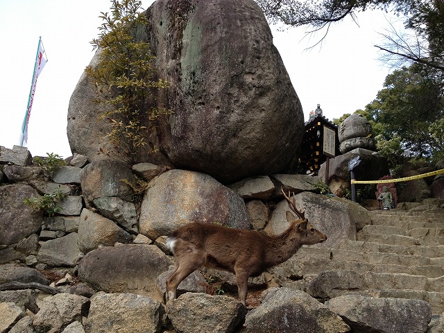 第一回目から早速一ヶ月ほど間が開きましたが、広島話の続きです。http://www.ric.hi-ho.ne.jp/joeshow/KA.Blog/20130715.html宮島は古来「神の島」とされ、かつては人が上陸することも許されない土地だったとのこと。その外観が「寝観音」、つまり山や谷の形が「観音様が寝ている」ように見えることから、そのような信仰が生まれた様子。↓寝観音が確認できるHPhttp://tabetainjya.com/archives/hatsukaichi2/post_108/その後、かの有名な天下人平清盛が厳島神社を深く信仰。現在の海上に建つ立派な社殿が整えられました。ちなみに何故社殿や鳥居が海にあるかご存じですか?上述のように「神の島」とされていることで、その陸地に人の手を加えることが畏れ多い、ということで海に造られたそうです。へぇー、と思った方は、お手元の「へぇ」ボタンを連打してください(;^_^Aそんな平清盛の願いは大河ドラマの視聴率までには及ばなかったようですが、お陰様で厳島神社は今では世界遺産。外国人観光客も多数訪れる神秘的な日本のパワースポットとなっています。そんなこんなで宮島に到着した我々を、鹿と旅館のバスがお出迎え。実は私は宮島はこれで3度目です。そのうちの一回は短艇という船を皆で漕いで、宮島の裏の方で皆でテントを貼ってキャンプをしました。その辺りのお話はまた後述。今回はちゃんと「岩惣」という老舗旅館に二泊。宮島で泊まるなら是非ここで泊まりたい、という嫁の強い希望がありました。その日はちょっと空模様が宜しくなく、小雨がパラつく感じ。フェリー乗り場から旅館までは歩いても行ける程度の距離なのですが、やはり迎えにきてもらって正解でした。夕方以降は車の移動が制限されるということで、山側をぐるりと遠回りして旅館へ。山道でも至る所で鹿を確認できました。恐らく島に住んでる人間の数よりも、鹿の方が多いのではないでしょうか?ちなみにかつて宮島の鹿といえば凶暴で有名で、観光客の紙幣とかを食べてしまう悪逆非道ぶりを発揮していました( ̄Д ̄;;どうやら今は大人しくなったような感じでしたが。我々が旅館に辿りついた頃には既に陽も暮れかかっており、長旅の我々もここに来てようやく腰を落ち着けることができました。(つづく)