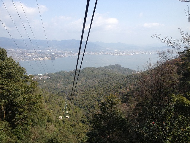 広島話の続きです。http://www.ric.hi-ho.ne.jp/joeshow/KA.Blog/20130715.html翌日。外に歩く鹿を眺めながら朝食をとった我々は、離れの喫茶店で目覚めのコーヒーをいただくと、宮島散策に出発です。その日はまず朝から宮島で一番高い弥山に登る計画でした。弥山は標高535mの小高い山で、宮島信仰の象徴とも言える場所。かつて私は競技会で荷物を背負いつつ20分程度で駆け上がったことがあります。今から15年近く前の若かりし頃の武勇伝ですが(-。-;)なので今回も駆け上がる・・・なんて無茶はしません。昨年住民運動会で思い切りすっ転んでしまったトラウマがあるので、己の限界を知っています。大人になるということはそういうことです。というわけで、今回は大人しくロープウェイで山頂を目指します(;^_^Aここのロープウェイには初めて乗りましたが、高所恐怖症の私にとっては怖い!( ̄Д ̄;;まあ私は歩道橋ですら恐怖を覚える人なので、普通の方は全然大丈夫です(;^_^Aちなみに、でも高い所は結構好き、という人でもあるのですが。バカと○○は・・・。20分くらいおののきながら乗るとやがて中継地点に到着し、そこで15人乗りくらいのロープウェイに乗り換えて山頂を目指します。やはり外国人の方が多かったですね。そしてようやく山頂へ。当日はすっかり晴天で眺望は最高!宮島の周囲の島々を一望できます(^^)ちなみに後日ラジオを聞いて知ったのですが、当日はラジオNIKKEIの鎌田記者もたまたまスーツ姿で登っていたとのことでした。残念ながら遭遇することはありませんでしたが。(つづく)