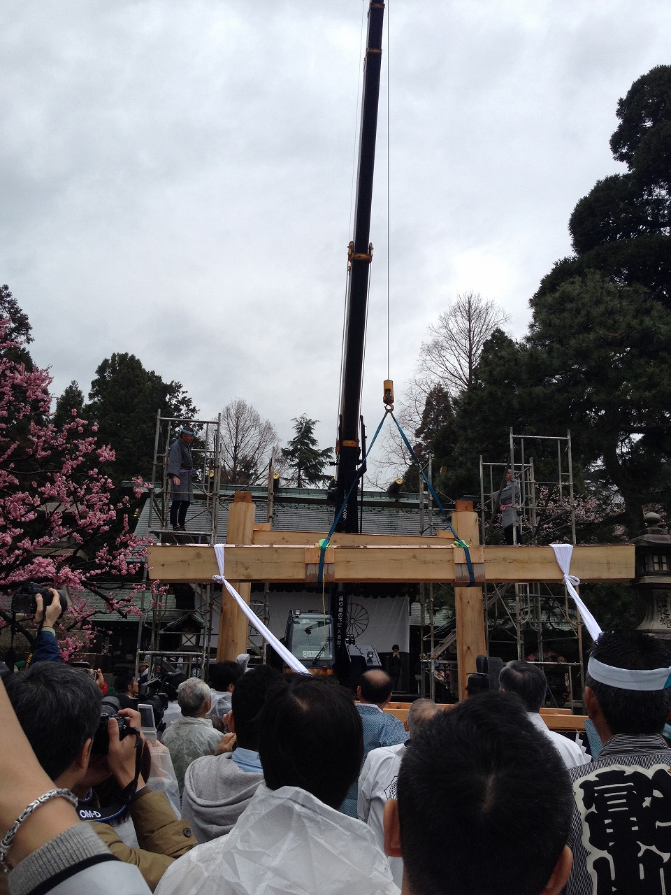 そんな私の心配をよそに「はしご登り」は続き、入れ替わり立ち替わり命知らずの猛者どもがハシゴの上に登っては、各々の技を披露しました。段々とエスカレートしてくる技にヒヤヒヤ。しかし皆いつどこで練習しているのやら(ーー;)ともあれ無事皆大成功に終わり、はしご登りも終わると、いよいよ笠木を鳥居に取り付ける段に移ります。笠木の両端に白くて長い布を結びつけ、それを皆で引っ張って持ち上げる態なのですが、実際にはクレーン車が笠木を持ち上げます。まあトン級の重さですから、現代テクノロジーが利用されるのも致し方無いですね(^_^;最後は鳶職の方々がしっかりと鳥居にはめ込んで見事完成(^_^)/~皆で拍手して完成を締めくくりました。市長や関係者の話が続き、最後はようやくその鳥居をくぐってお開きとなりました。というわけで、そんな伊勢神宮のパワーをもらって御利益倍増(?)の射水神社に皆様も是非一度ご参拝ください(^_^)ノちなみに私はこの鳥居が出来る前から毎朝散歩がてらに射水神社に参拝していますが、参拝すると何故か株が下がります(連騰ストップも私のせい?)それでも尚日課を止めないのは、単なる意固地でもありますが・・・(ーー;)