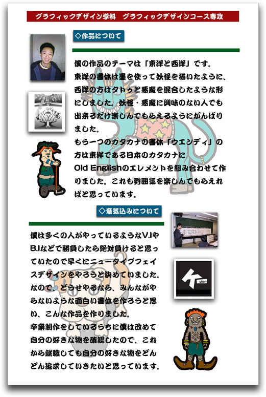 どうも。管理人のケーちゃんです。こちらも前回に引き続き学生の頃に描いた作品。キャラクターですね。コミカルなタッチ描いてみました。僕はイラストレーターで絵を描くことが多いので、この作品を見て貰えば僕イラストのタッチが分かって貰えると思います。割と気に入っているかな。今は、もう少し大人っぽい作品が多いので、学生の頃に描いたイラストは何だか懐かしくおもったりしながら、この日記を書いています。こうして、過去の作品を埋もらせることなく、公開出来ることを考えると、ブログを立ち上げたことも、何だか嬉しく思えるってなもんですね。現在は仕事柄忙しいので、過去の作品などを少しずつアップして行く予定なので、お時間がある方や興味を持って下さる方があれば、是非是非見てやって下さい。何だか気分が乗ってきたので、新作制作の意欲がわいていました。コレもブログを立ち上げた効果です(笑)ご感想などあれば是非。