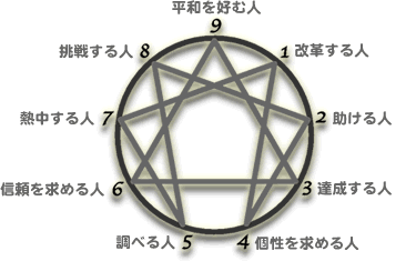 ここ数年エニアグラムというものにとても惹かれています。自分自身よく使っていて感動しているので紹介します ( ´∀`)σ世界中に均等に9タイプの人間が存在しており、それぞれ違った行動、考え方、感情の原理というものがあることで、バランスがとれているというものです。ある親友からこれを教わって、それから2年近く立ちますが、人を知れば知るほど、このエニアグラムというものがいかに的を得ているかということがわかります。ちなみに僕はタイプ5という性質に当てはまります。どんな人なのかというと、客観性に優れていて、論理的に物事を考え、知識を周りの世界からかき集め、真実を見極めるといった性格だそうです。性質としてもエニアグラムに興味を持ちやすいタイプのようです。それぞれ9タイプを簡単に書いておきます。タイプ1:理想主義(星一徹)タイプ2:人間関係主義(ドラエモン)タイプ3:成功主義(峰不二子)タイプ4:自分主義(スナフキン)タイプ5:知識主義(シャーロック・ホームズ)タイプ6:忠実主義(マスオさん)タイプ7:楽天主義(サザエさん)タイプ8:自力主義(ジャイアン)タイプ9:平和主義(ドカベン)それぞれ相互関係になっていて、自分に固執して、周りが見えなくなって行くと、自分のタイプの能力しか使えなくなり、さらには歪んだ使い方をしてしまうようになるけれども、逆に寛容になり、色んな人と調和を求めるようになると、両脇のタイプずつ気持ちがわかったり、能力がつかえるようになったりします。そして、上の図みたいにも相互関係になっていて、例えば自分自身を例に出しますけども、タイプ5がいい調子だと普段は一人で考えたて楽しんでいるところだけれどタイプ8のように積極的に体で行動するようになり、実行力のあるエネルギーに満ちた状態になります。逆に調子が悪ければ、本来一人で何かに集中する事で物事を見極めて行けるところが、タイプ7の悪い部分が出て来て、何事も中途半端になり、いい加減で、ラリってしまっているような状態になります。まさにその通りなんです!!最近は調子いいので、こういう風に書いてみたり、自分が得て、気づいて感動した事を進んで人に言っていってます。前までは知ってるだけで自分の体験として言えなかったり、まとまってなかったりしてたけど、マシになってきてるんじゃないかと思ってます( *´艸`)自分としては全部のタイプの人ともっともっと知り合って、心の原理を知って、それを役立てていければと思い、人との出会いを楽しんでおります。興味があれば是非知って欲しい知識→知恵です。気が向き次第エニアグラムの内容を展開して行きたいと思いますヾ(*´∀`*)