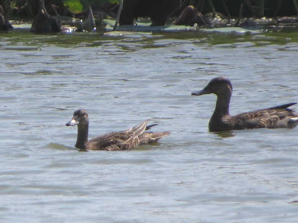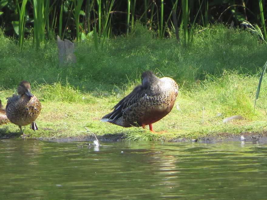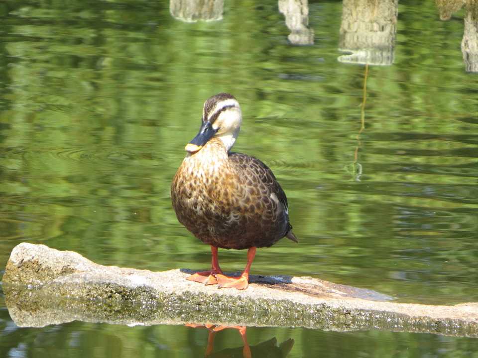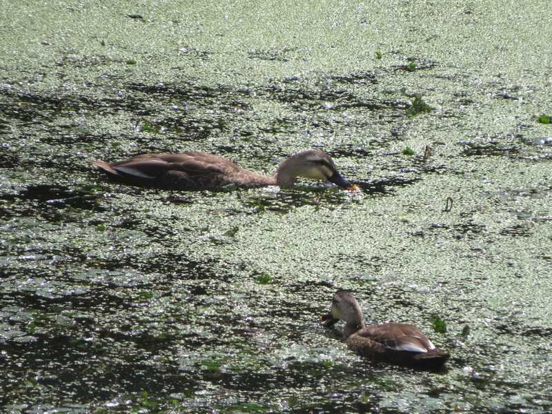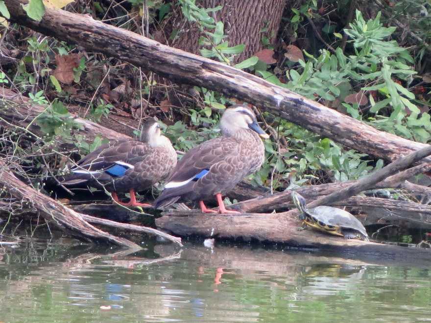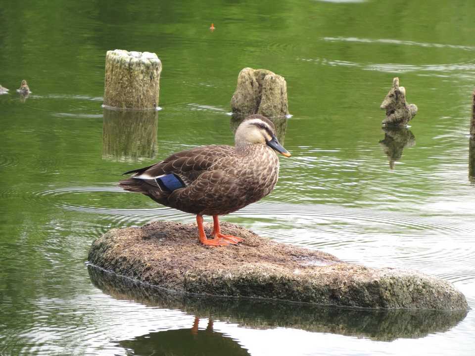お天気が不安定で、時折雨が降るとの予報でしたので、コンパクトに探索ができて雨宿りも可能なフィールドの舎人公園を訪ねました。広さ65haの公園のうち、東側エリアをメインに鳥たちの姿を探しました。(ツツドリとツミの姿を発見)花見広場と芝生広場の一角でツツドリ赤色型2羽、ツミ幼鳥3羽を発見しました。ツツドリは、上面の地が赤褐色で、胸の縞模様は太いこと、下尾筒に横斑がありました。しかし、カラスに追尾されて林の一角の木の中に退避してきたので、撮影はかなわず。(カルガモとマガモの交雑個体)大池では、カルガモ9羽、カルガモとマガモの交雑個体12羽の姿がありました。上面が暗褐色で下尾筒の色などはカルガモの特徴がありますが、嘴は黄色で過眼線はうっすらで過眼線はカルガモに比べて細い個体、体全体が白っぽく、頭央線が薄く太い眉斑がない個体など実にいろいろな個体と出会いました。マガモとカルガモの交雑は、形態や生態が似ているおり、たやすく交雑すると言われています。外見が親鳥のどちらかと似ていたり、あるいは中間的な特徴を持っていたりします。(その他、観察できた鳥たち)頬から後頭部が赤褐色のカイツブリ夏羽、ツツドリ、ツミ幼鳥を追尾していたハシブトガラス、地面でひたすら餌探しに余念のなかったハシボソガラスの群れを観察しました。(これから秋、楽しみな出会い)これから10月にかけて、小鳥たちが立ち寄っていくと思います。次の訪問が楽しみです。(写真)2025年9月13日撮影